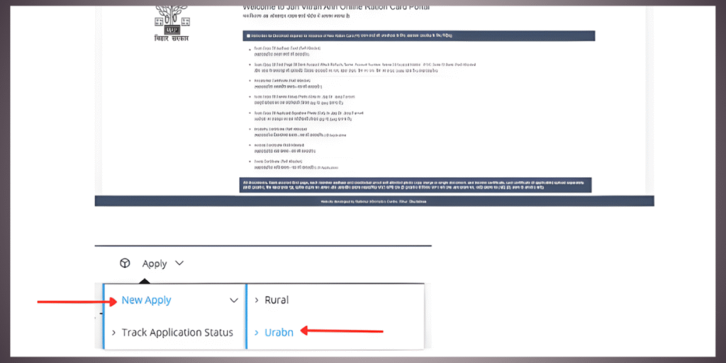 - After logging in, click ‘Apply’ and choose ‘New Apply’ for either a rural or urban ration card.